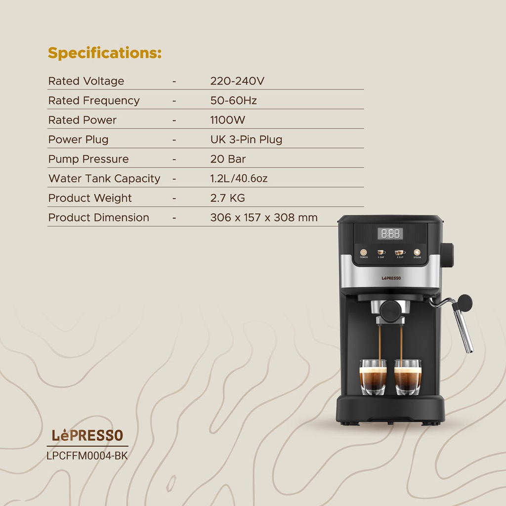 صُممت ماكينة Lepresso Suprema لتحضير الإسبريسو لعشاق القهوة الذين يتطلعون إلى جودة مماثلة لتلك التي يقدمها خبراء القهوة في منازلهم. بقوة 1100 واط وجهد 220-240 فولت وتردد 50-60 هرتز، توفر الماكينة ضغطًا عاليًا يصل إلى 20 بار، مما يضمن تحضير إسبريسو غنيّ وكامل النكهة في كل كوب. كما تتيح شاشة اللمس الأنيقة والسهلة الاستخدام إمكانية ضبط اختيارك من القهوة فورًا.